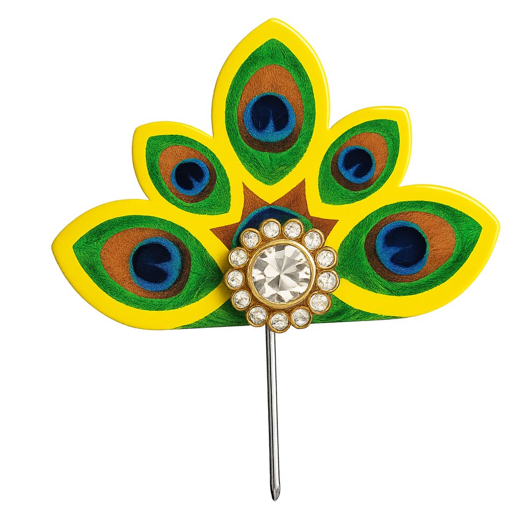 Bring divine elegance to your Laddu Gopal idol with this stunning Yellow Peacock Feather Kalangi. Crafted with authentic Mor Pankh feathers in vibrant yellow tones and embellished with a sparkling stone centerpiece, this kalangi adds a royal and devotional touch to your deity’s appearance. Ideal for Janmashtami, Radha Krishna festivals, pooja rituals, and temple decorations, it enhances the traditional charm of Bal Gopal. A perfect accessory for devotees who wish to decorate their beloved Krishna in style.